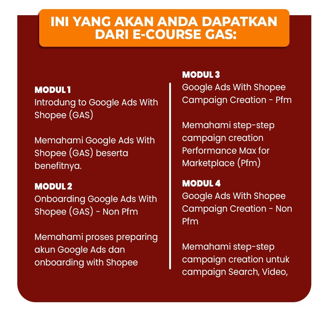 Makanya, biar nggak bingung dan nggak buang-buang budget, kita bikin course “Google Ads with Shopee” — panduan praktis khusus buat seller Shopee.